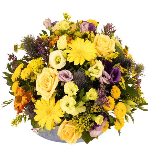 Een bloemstuk in de fraaie vrolijke kleuren geel en blauw. Rond opgestoken. Ideaal voor zo op tafel te plaatsen. Thuiswinkel Lid. Bestellen gaat eenvoudig.