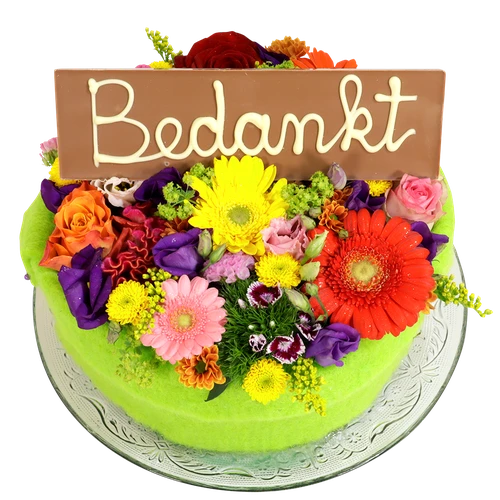 Een bloementaart met chocolade. De chocoladereep bedankt is in de bloementaart verwerkt. Compleet om zo cadeau te geven.
