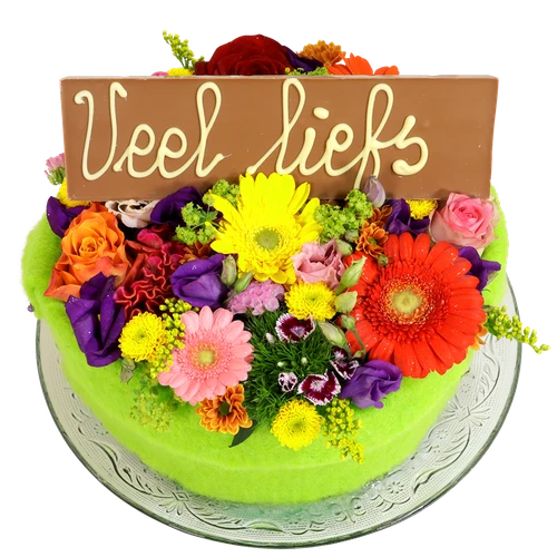 Een heerlijke chocolade reep met de tekst: “Veel liefs” er op verwerkt in een taart van bloemen in de bonte kleuren. Thuiwinkel lid. Bestel eenvoudig.