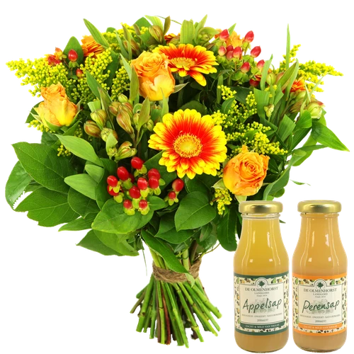 Frisse bloemen in het geel oranje, een mooi vrolijk boeket samen met lekkere sappen Olmenhorst sappen, BoeketCadeau meer dan alleen bloemen bezorgen. Thuiswinkel lid