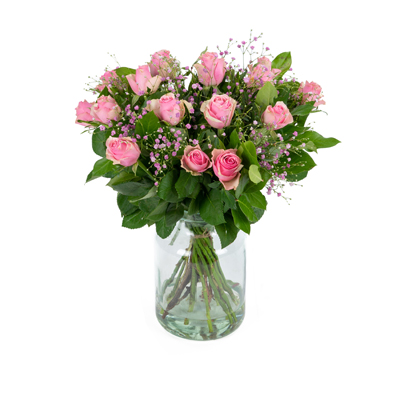 Liefdevol rozenboeket met zachte roze rozen van ongeveer 40cm aangevuld met roze gipskruid indien voorradig.