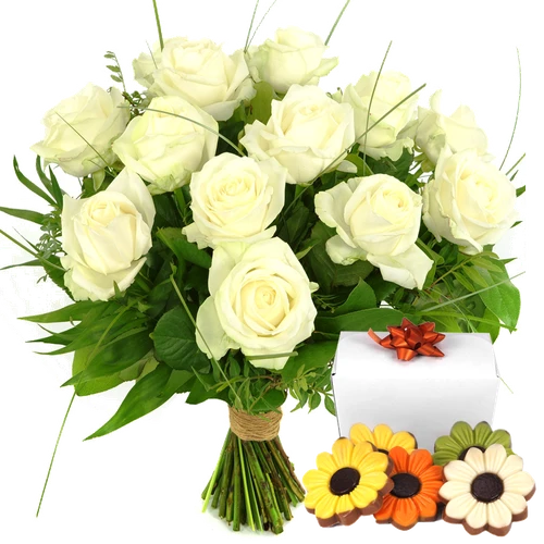 Boeket witte rozen + bloemetjes chocolade bij plantenwinkel