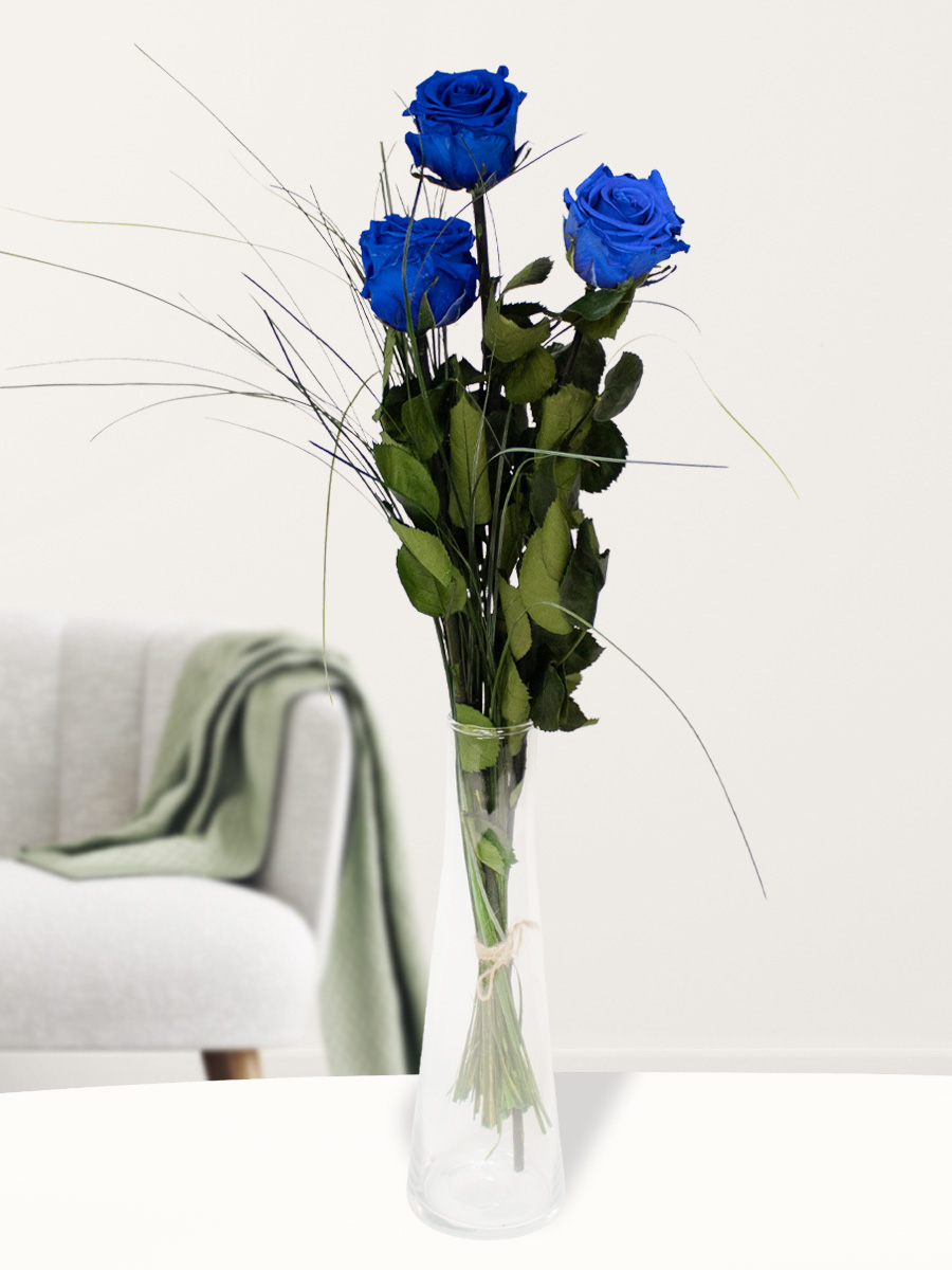 Drie blauwe long life rozen inclusief vaasje bij plantenwinkel
