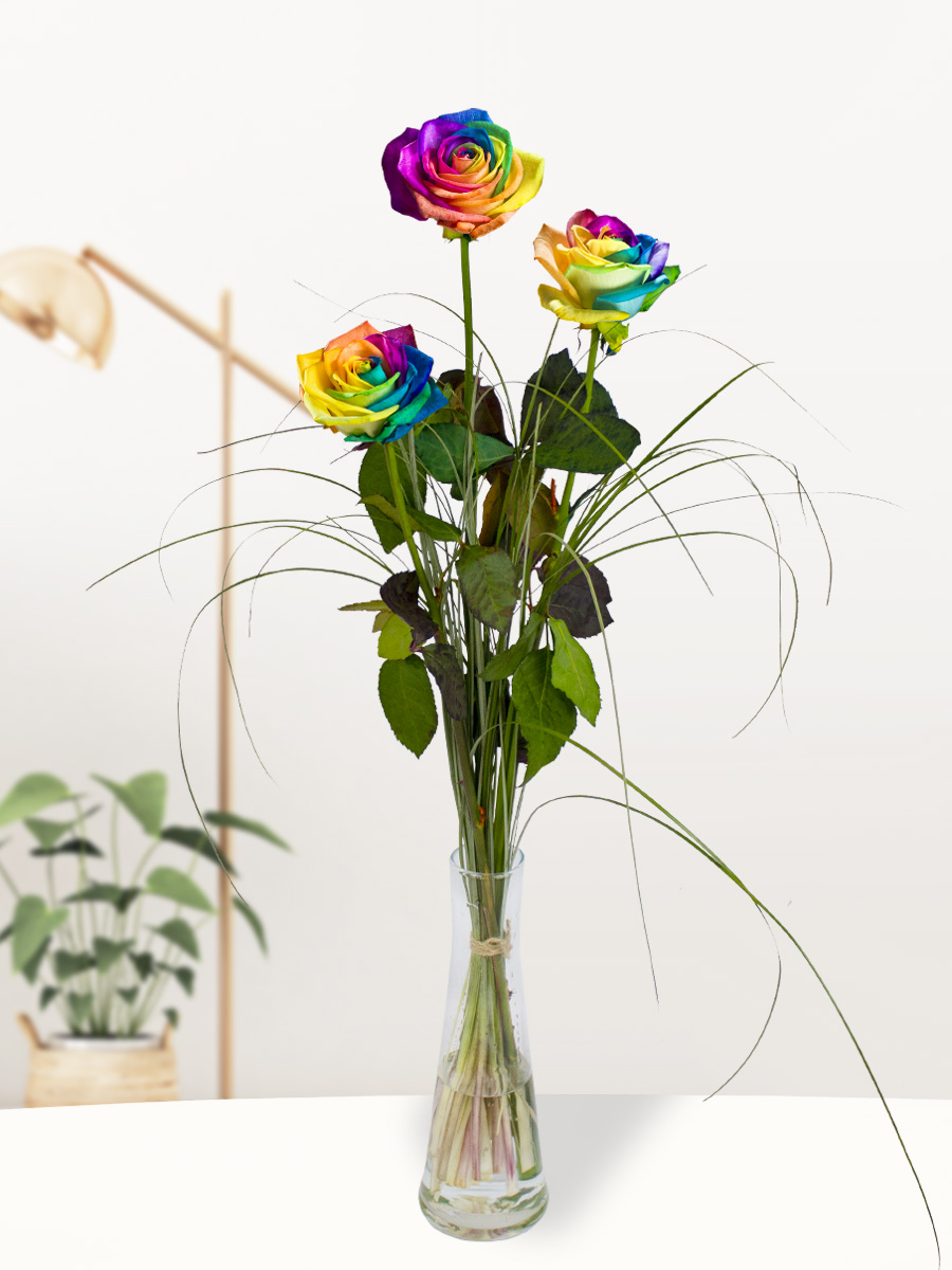 Drie regenboog rozen, inclusief vaasje bij plantenwinkel