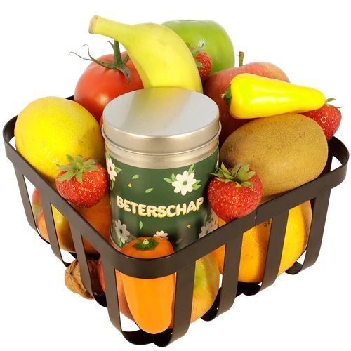 Vers fruit een fruitmand beterschap met een blikje beterschap compleet met fruit geleverd. Een mooi stalen zwarte mand om ook later nog te her gebruiken. Bestel vandaag nog.