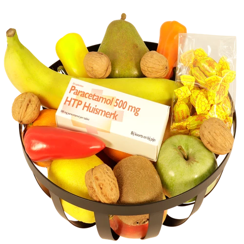 Heerlijk vers fruit in deze fruitmand paracetamol + zakje honing snoepjes. Makkelijk bestellen en binnen 24 uur laten bezorgen in heel Nederland. Thuiswinkel lid.
