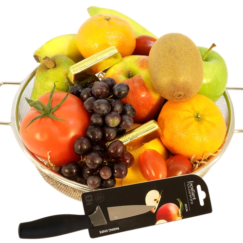 Een fruitschaal heerlijk met vers fruit en als bonus een stevig fruitmes, samen compleet geleverd. Handig voor de ontvanger.