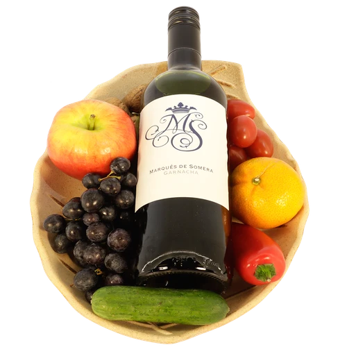 Mooi vers fruit opgemaakt naast een lekkere fles rode wijn. Een fraaie attentie om cadeau te geven voor de ontvanger. Thuiswinkel lid.