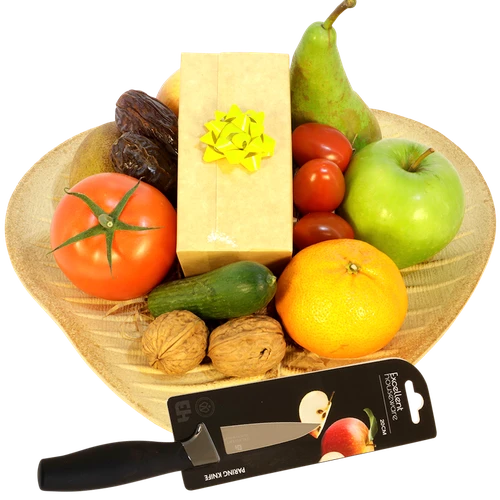 Heerlijk vers fruit en 150 gram bonbons en een stevig fruitmes geeft deze complete fruitschaal cadeau. Bestel eenvoudig en kies je eigen bezorgdag