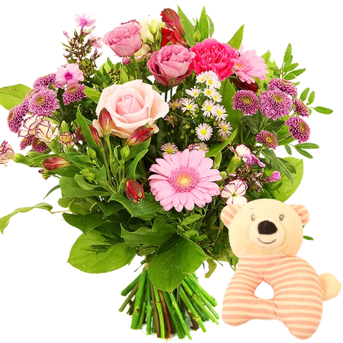 Een roze geboorte boeket voor een meisje en een leuke rammelaar een prachtig kraamcadeau. Snel bezorgd binnen 24uur. Makkelijk bestellen.