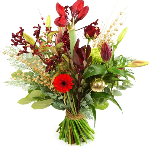 Kerstboeket in het rood, goud waarvan de bloemen hoog en laag geschikt zijn. Dit geplukte boeket kan bezorgd worden in heel Nederland. Bestel vandaag nog! Thuiswinkel Lid.