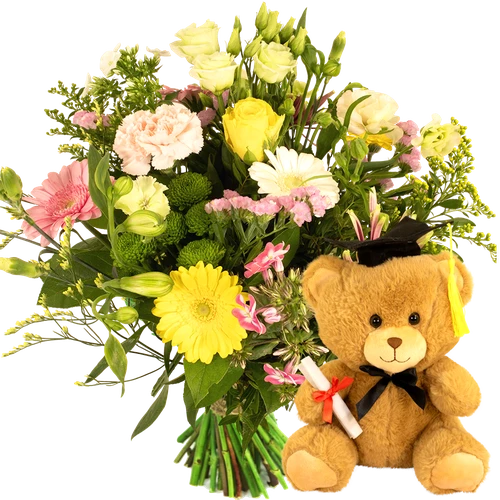 Een vers boeket bloemen voor een geslaagde en een geslaagd knuffelbeer samen geleverd in heel Nederland. Bestel eenvoudig. Snel bezorgd.