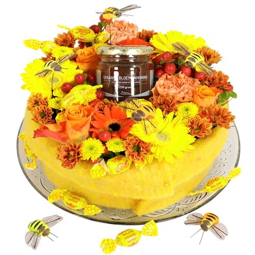 Een bloementaart met een potje honing en heerlijke honing snoepjes en zoemen de bijen boven de bloemen. Een unieke bijzondere honing bloementaart bij BoeketCadeau.nl