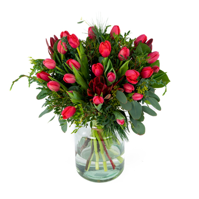 Dit tulpenboeket kan bij beschikbaarheid geleverd worden met kerstballen