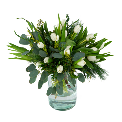 Dit tulpenboeket kan bij beschikbaarheid geleverd worden met kerstballen