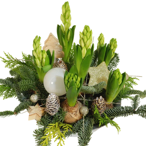 Kerststuk ca. Ø 23cm met witte hyacinten bij plantenwinkel
