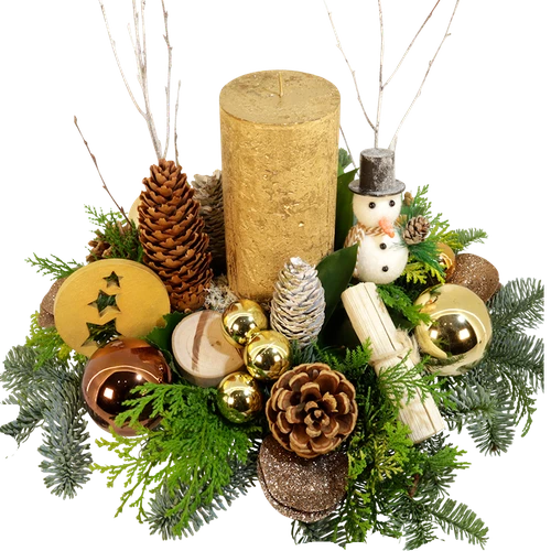 Kerststuk goud met dikke kaars bij plantenwinkel