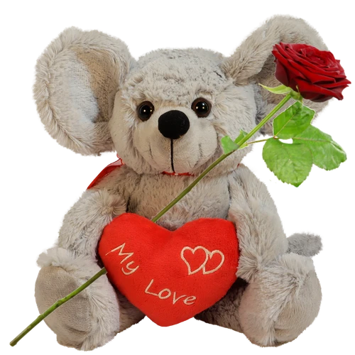 Knuffelige grijze muis ca. 28cm met rood hart bij plantenwinkel