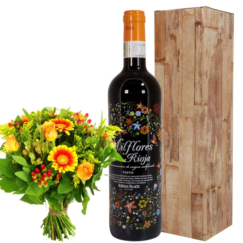 Een heerlijke rode wijn uit de serie Milflores. Een vrolijk bijzonder etiket in een geschenk verpakking. Bloemen en wijn worden samen bezorgd. Thuiswinkel lid.