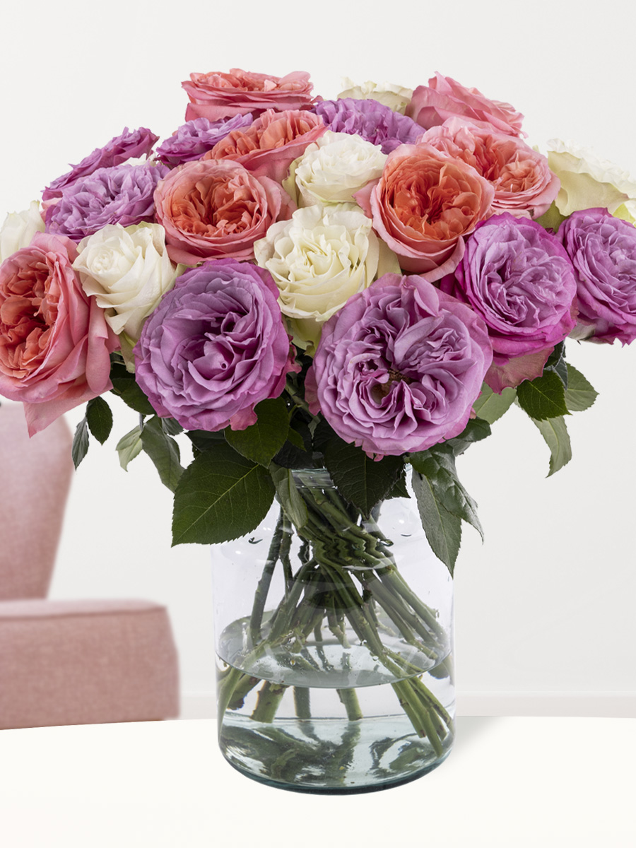 Een perfect boeket voor gelegenheden als: een verjaardag, een jubileum of zelf een huwelijk! De rozen zijn van zeer hoge kwaliteit en onderscheiden zich in de rozenbladeren. De rozenbladeren van deze rozen zijn veel bloemvormiger dan bij andere rozen. Deze rozen lijken een beetje op de Engelse David Austin rozen of zelfs wel een beetje aan pioenrozen. Verras iemand anders met een prachtig boeket van 30 rozen, wij doen er dan rozenvoeding bij en voegen jouw wenstekst of videoboodschap toe!