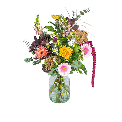 Frisse kleuren met een vleugje warmte. Laat de ontvanger genieten van een prachtig veldboeket.