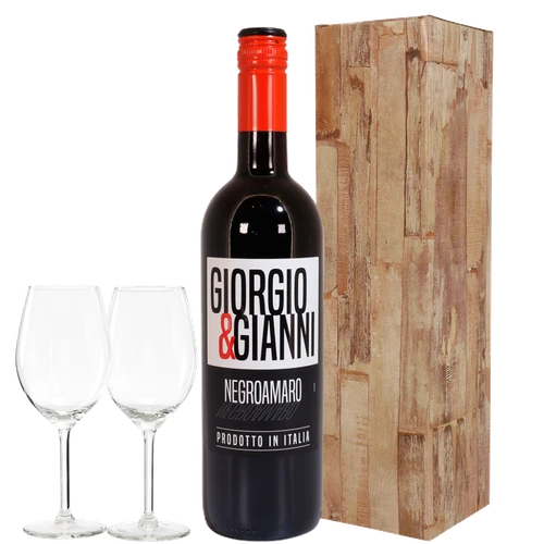 Heerlijke rode Italiaanse wijn van Giorgio & Gianni samen met 2 wijnglazen het perfecte complete cadeau. Bestel vandaag nog. Thuiswinkel Lid. 24/7 bezorgen in NL.