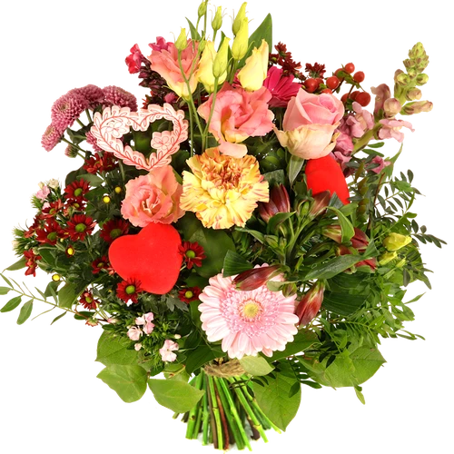Valentijnsdag dan geef je een Valentijn boeket cadeau aan jouw geliefde. Valentijn bloemen in roze rode kleuren met harten en veren. Thuiswinkel Lid. Bestel op tijd!
