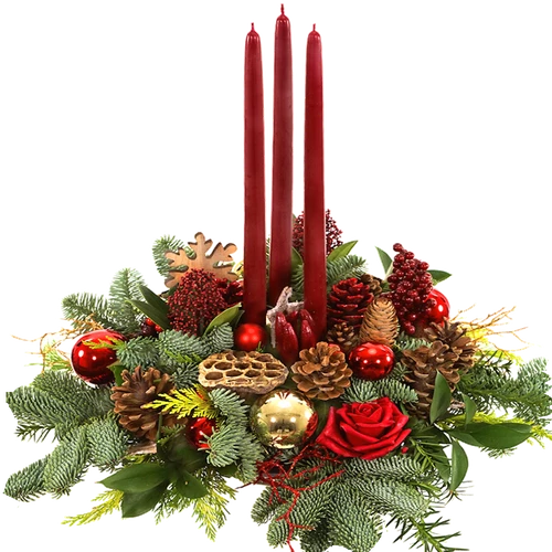 Kerststuk voor op tafel, een rond rood – goud kerststuk met 3 kaarsen van 40 cm per stuk. Bestel op tijd op = op.