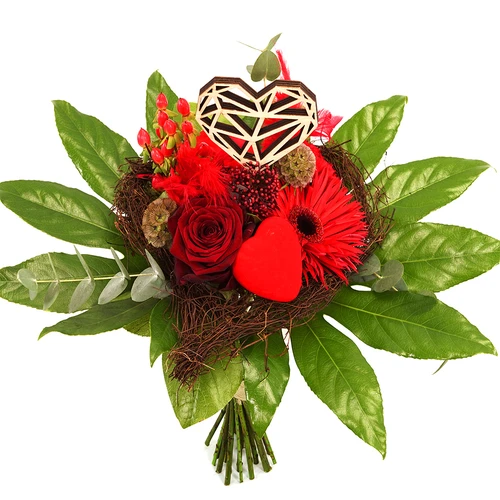 Boeket in een hart frame met rode bloemen. Lief rood boeketje met hartjes en veren en een houten diamant hart in het midden. Bestel op tijd. Thuiswinkel lid
