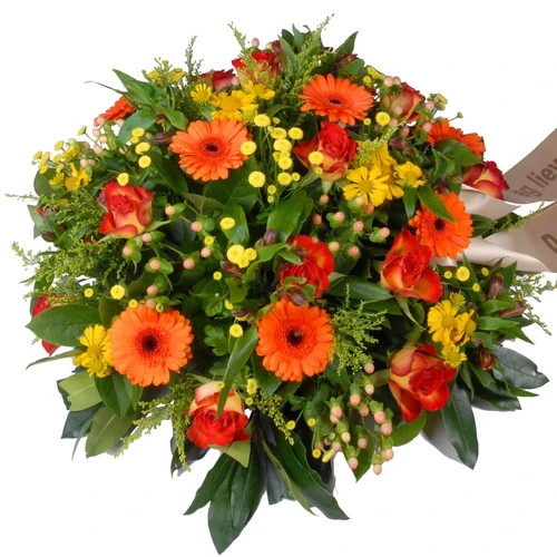 Rouwbiedermeier oranje geel bestellen, bezorgen met lint erbij. Bepaal zelf de tekst. Rouwbloemen bezorgen in heel