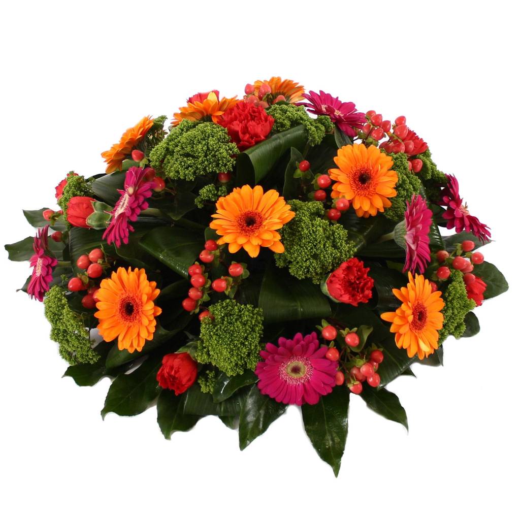 Rouwbiedermeier met gemengde Germini’s in warme tinten en rode Anjers afgewerkt met Aspidistrablad. Dit rouwstuk is beschikbaar in een ‘Groot’ variant en heeft een diameter van ca 40 cm. Een rouwlint of -kaart kunt u in de volgende stap toevoegen.