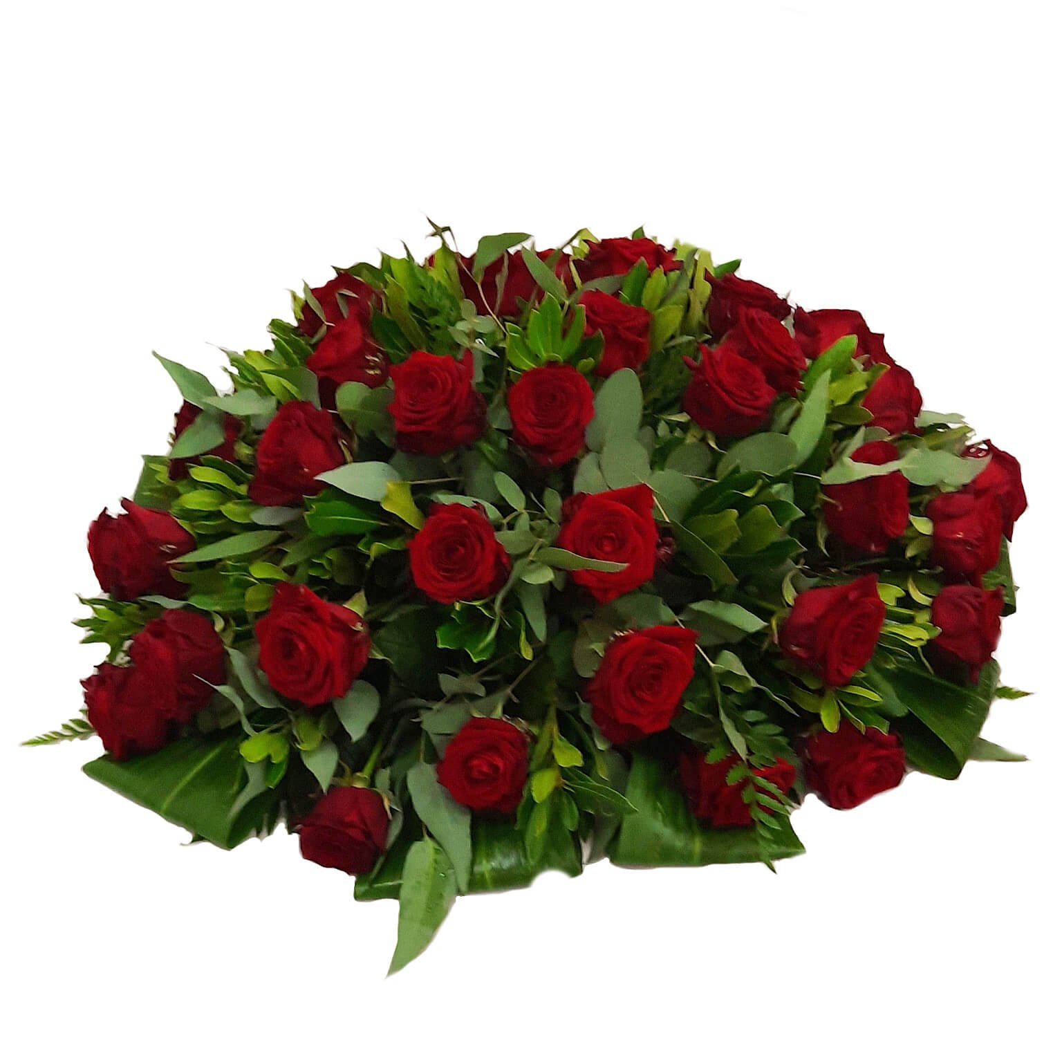 Rouwbiedermeier rode Rozen met diverse soorten blad. Dit rouwstuk is beschikbaar in een ‘XL’ variant en heeft een diameter van ca 60 cm. Een rouwlint of -kaart kunt u in de volgende stap toevoegen.