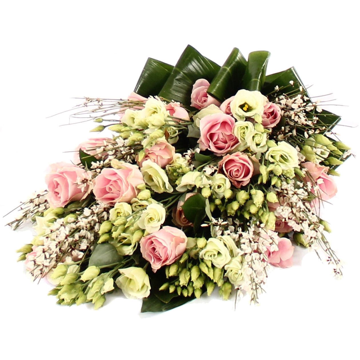 Rouwboeket met roze Rozen in combinatie met groene Lisianthus en Brem afgewerkt met Aspidistrablad. Dit boeket heeft een steellengte van ca 45 cm. Een rouwlint of -kaart kunt u in de volgende stap toevoegen.