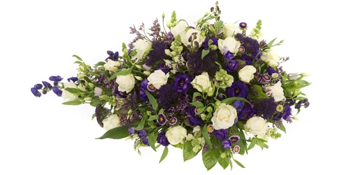 Rouwstuk met o.a witte rozen en paars witte rouwbloemen ca. 80 cm lang bestel je vanaf € 79,95
