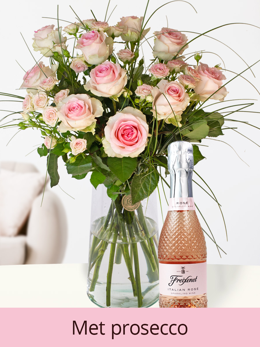 Rozenboeket Eva + prosecco rosé 0,2L bij plantenwinkel