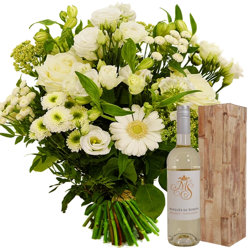 Verse witte bloemen laten bezorgen met een heerlijke fles witte wijn voor Moederdag. Bestel nu en laat deze op Moederdag bezorgen. Thuiswinkel Lid.