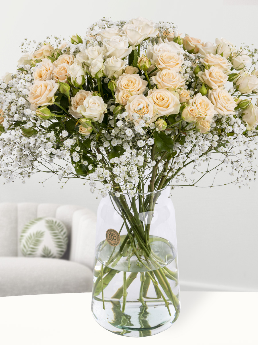 De rozen van Voorn Roses zijn van hoge kwaliteit en komen direct van de kweker bij onse bloembindsters. Onze bloembindsters binden een prachtig boeket van witte en crèmekleurige trosrozen, samen met gipskruid. Ze binden er een prachtig en speels boeket van. Om het boeket komt een papier, zodat het boeket niet beschadigd onderweg. Zo kun jij het langst genieten van je boeket!