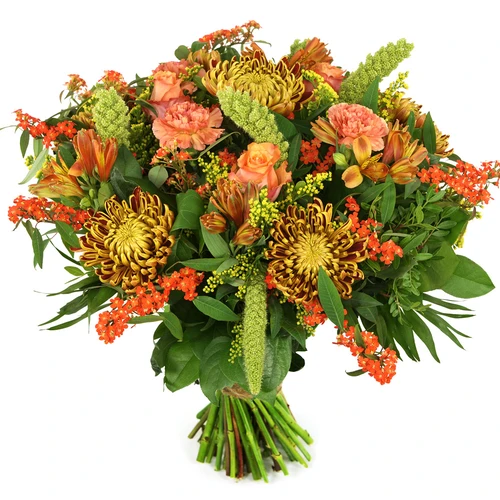 Uitbundig herfstboeket brons oranje bij plantenwinkel