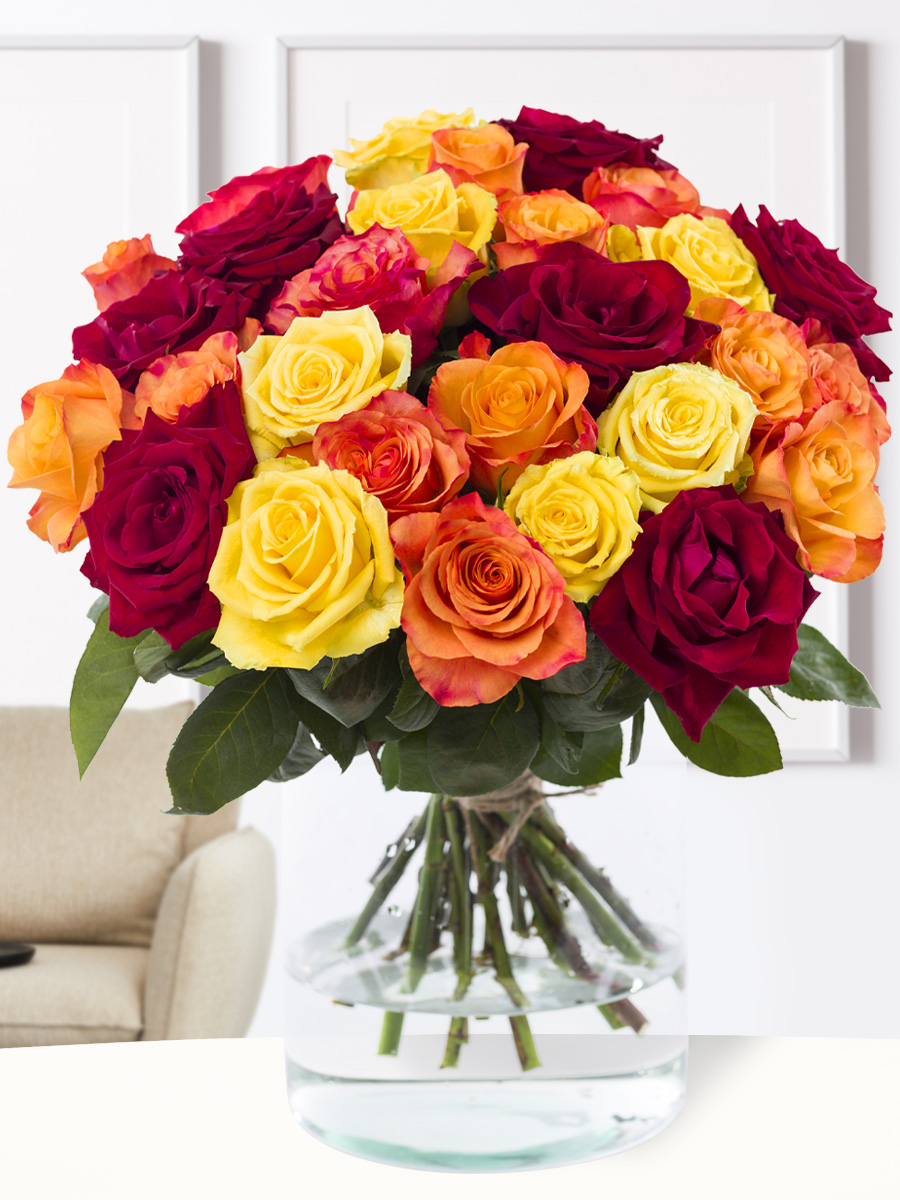 Door deze speciale kleurencombinatie van geel, oranje en rood geeft dit boeket een vurige indruk in elk interieur. Dit boeket komt het beste tot uiting in een ruime vaas waarin de stelen elke kant op kunnen. Zorg voor een bijzonder en kleurrijk cadeau met dit boeket van een vurige mix van Surprose. Al onze boeketten worden in onze speciale verpakking verzonden zodat de rozen onbeschadigd en vers aankomen op de juiste bestemming. In deze doos wordt ook rozenvoeding en een kaartje mee verpakt waarop een persoonlijke wenstekst mogelijk is. Verras nu met Surprose!