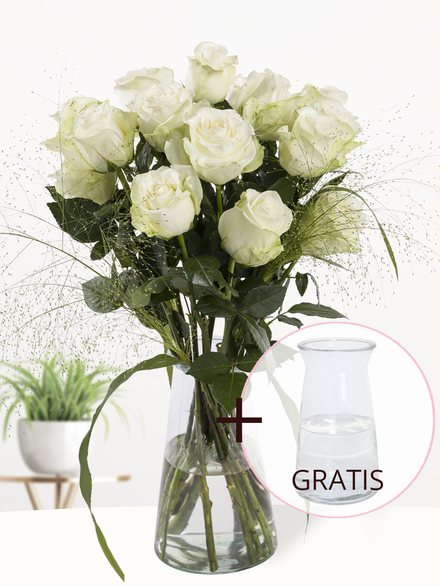In dit boeket zitten 15 hoge kwaliteit witte Snowstorm rozen. De Snowstorm rozen zijn witte rozen uit Kenia die bekend staan om de goede kwaliteit en grote bloemenknop. Kenia ligt op de evenaar en heeft daarom het perfecte klimaat voor de rozenteelt. De rozen uit Kenia hebben dan ook het hele jaar door dezelfde goede kwaliteit. Het boeket wordt opgevuld met leuke panicum, zodat het altijd mooi vol in de vaas staat. Dit boeket is perfect als cadeau, omdat jij de glasvaas er gratis bij krijgt. Je hoeft je dus geen zorgen te maken dat diegene niet de juiste glasvaas heeft om het boeket mooi tot haar recht te laten komen.Â