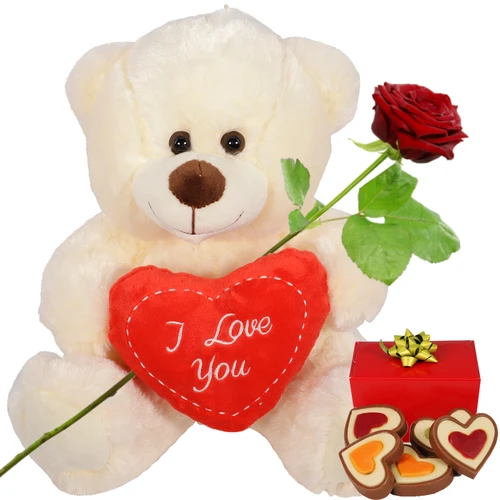 Pluche witte knuffelbeer met een rood hart in zijn handen met de tekst I Love you er op. Kan bezorgd worden met een verse rode roos en hartjes chocolade. Thuiswinkel lid.