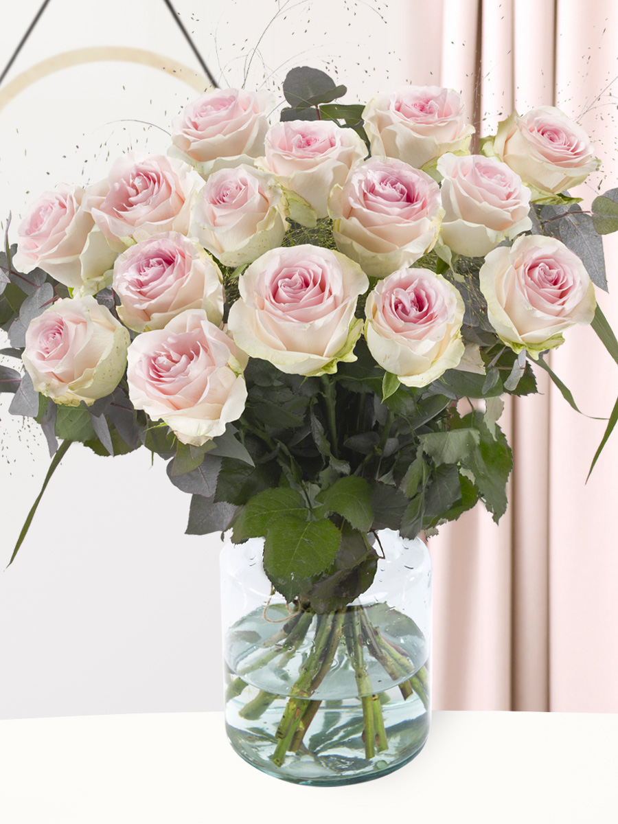 Zachtroze rozenboeket met panicum en eucalyptus bij plantenwinkel